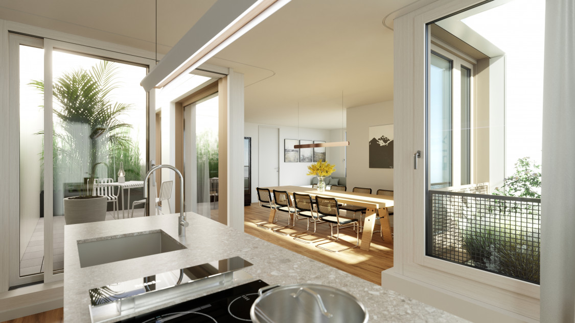 Das Thema „Grün“ nimmt im gesamten Quartier eine zentrale Bedeutung ein. Die Freifläche des Baufeldes wird in zwei Zonen gegliedert. Im nördlichen Bereich entsteht ein urban gestalteter Aufenthaltsraum, der den Zugang zum Foyer des Wohnhochhauses sowie zu den Ladenflächen ermöglicht – zugleich wird dieser Bereich als begrünter Freiraum mit Außengastronomie und einem Springbrunnen attraktiv gestaltet.